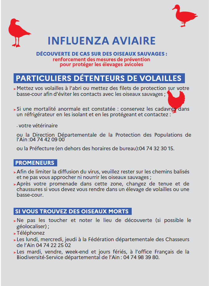 – Surveillez quotidiennement leur état de santé. En cas de mortalité anormale, ne touchez pas les cadavres : isolez-les et contactez votre vétérinaire ou la Direction Départementale de la Protection des Populations (DDPP) de l’Ain au 04 74 42 09 00.
