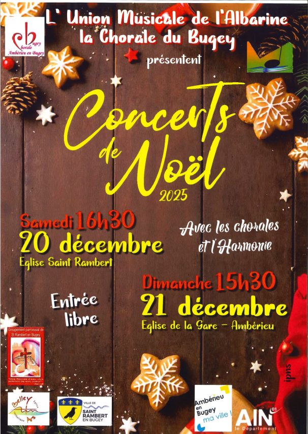 L’Union Musicale de l’Albarine et la Chorale du Bugey vous invitent à célébrer la magie de Noël à travers deux concerts festifs et chaleureux.