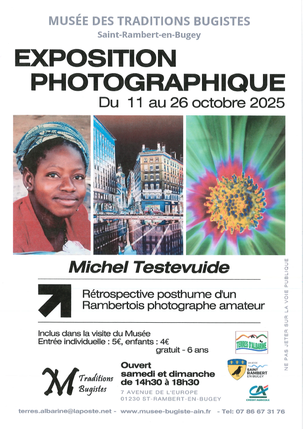 Le Musée des traditions bugistes accueille du 11 au 26 octobre une exposition à titre posthume des photographies de Michel Testevuide, passionné et amoureux de l’image. Sa famille a généreusement prêté ses clichés pour partager son regard unique sur notre territoire et ses habitants.